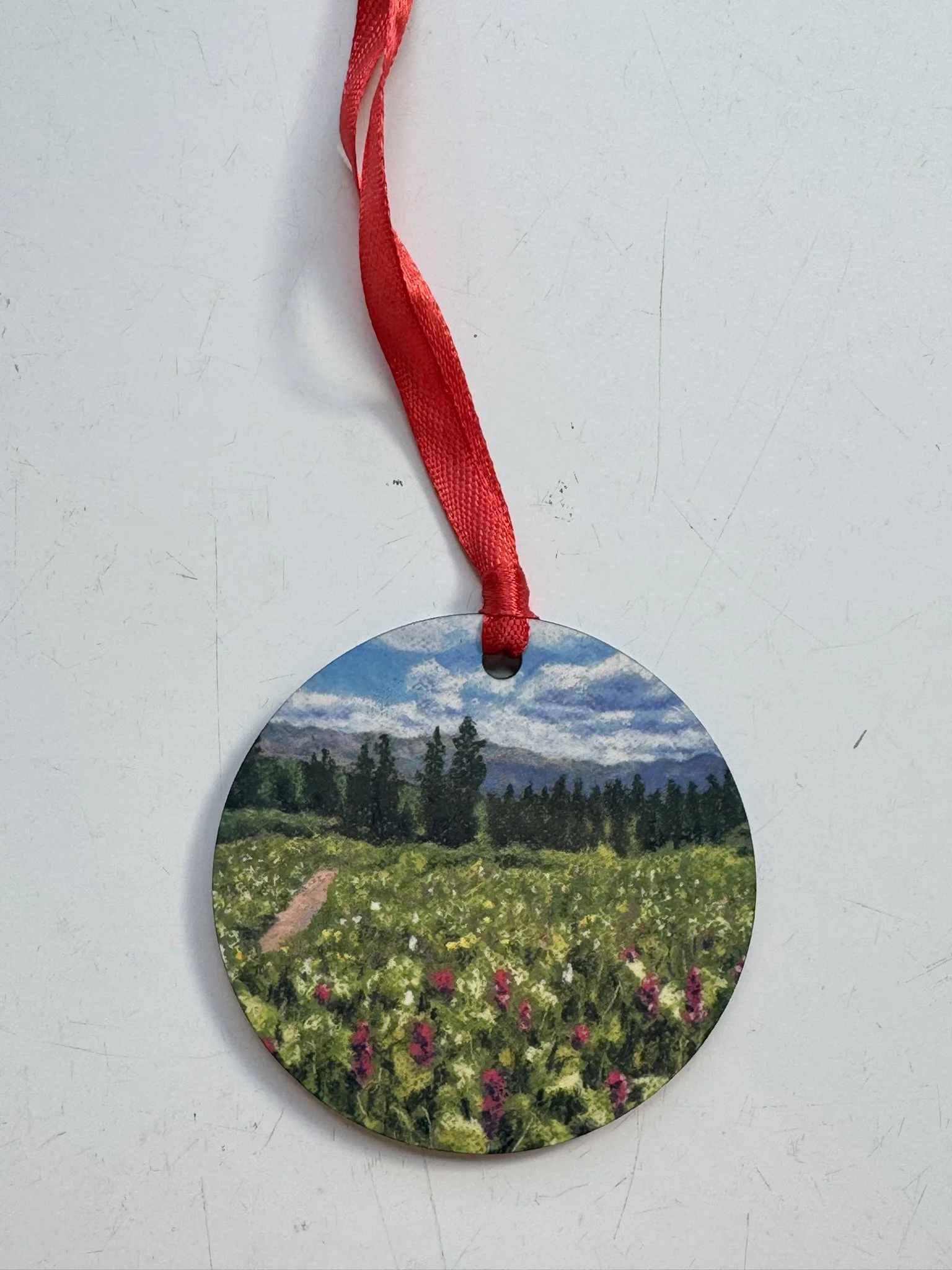 2.75” round wooden ornament featuring the painting “Lupine”; double sided printing